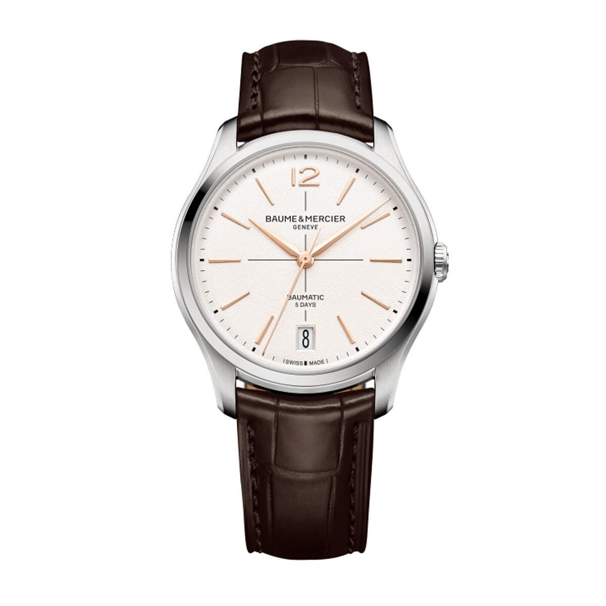 Baume & Mercier, opgericht in 1830, is een Zwitserse horlogemaker met een rijke geschiedenis van innovatie en technische excellentie. In 1973 introduceerde het merk de Riviera, een van 's werelds eerste stalen sporthorloges. Tegenwoordig omvat het assortiment onder andere de Clifton-, Classima- en Hampton-collecties, die zowel mannen als vrouwen aanspreken. Horloges uit de Clifton- of Riviera-collectie die zijn uitgerust met het in-house Baumatic-uurwerk bieden een verlengde garantie van zes jaar bovenop de standaard twee jaar, wat resulteert in een totale garantieperiode van acht jaar. Het Baumatic-uurwerk staat bekend om zijn betrouwbaarheid en nauwkeurigheid, dankzij de nieuwste generatie van dit kaliber.